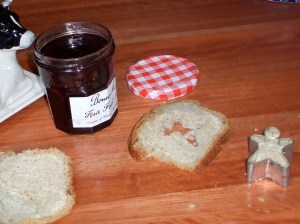i think it’s the darkness of a december morning that i especially love. darkness on the other side of the panes. a blanket of black. inside, so many little lights. especially on this, the feast of santa lucia, yet another miracle of light here in the passage of deepest darkness. it is especially enchanted here on maple lane because we have our own home-grown lucia, a beauty of a now-16-year-old, golden-haired girl. with the trail of swedish princesses and tomten behind her, she dons the candle-lit wreath and breaks open the darkness with her swanlike promenade, sidewalk to street to sidewalk, icicles some years practically dripping from her nose. she is undeterred by anything. if the calendar reads “13 december,” she is under the wreath, she is walking, white robe flowing. and so, as my little tedd awoke this morn, i exclaimed, “it’s santa lucia day.” ever trying to delight him into eating, i offered bread and jam and cheese; “swedish,” i said, spinning. and without skipping a beat, he darted toward the cookie cutter cupboard and insisted, “cut in gingerbread shapes.” but of course. and so, with the blanket of darkness just beyond the panes, we cut out oat bread into gingerbread boys, and dressed them thickly with raspberry pants and raspberry sweaters. to keep the cold away.