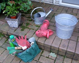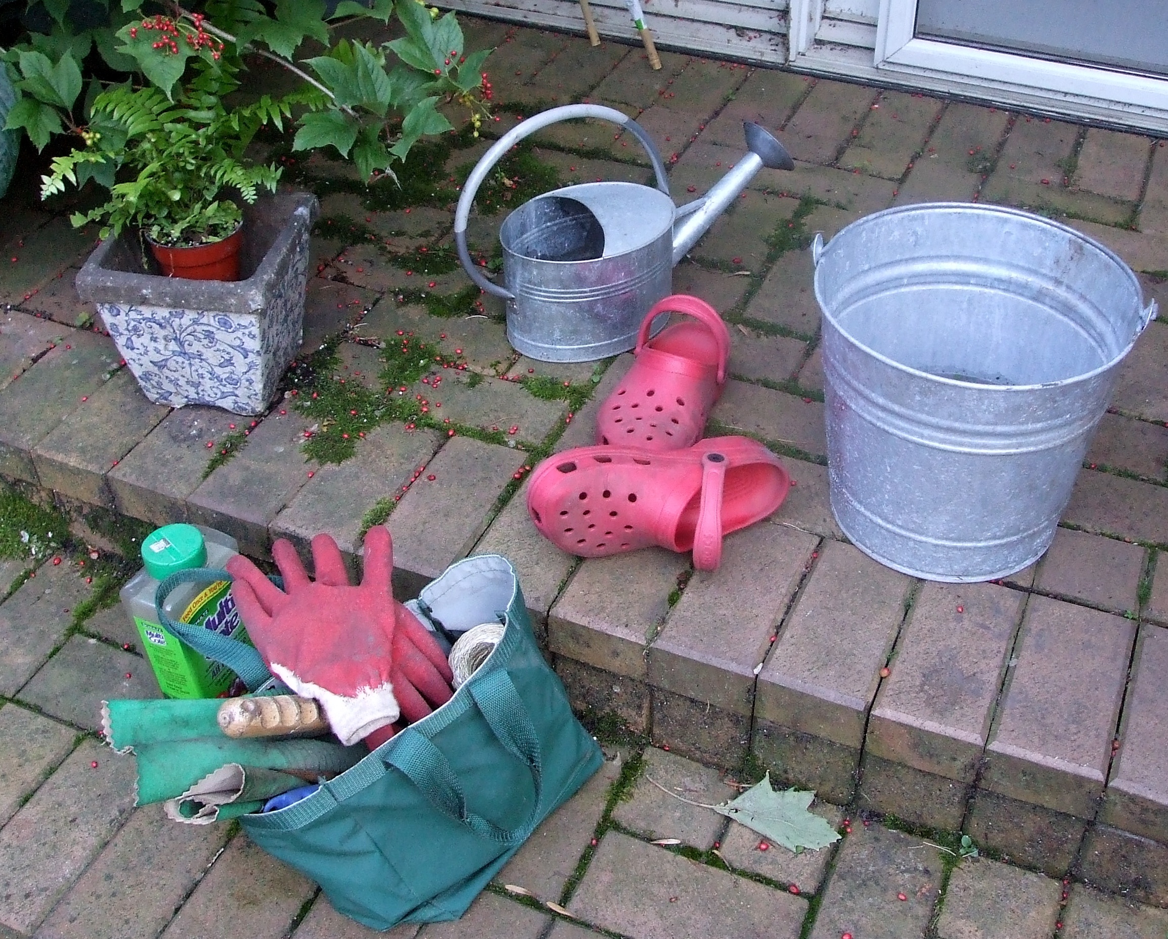 confession: the scatterings up above–plastic shoes, rubber gloves, old tin bucket and watering can, satchel for twine, trowel, assorted whatchamabobs–they are the first things i pick up in the morn, the last things i drop after dark.