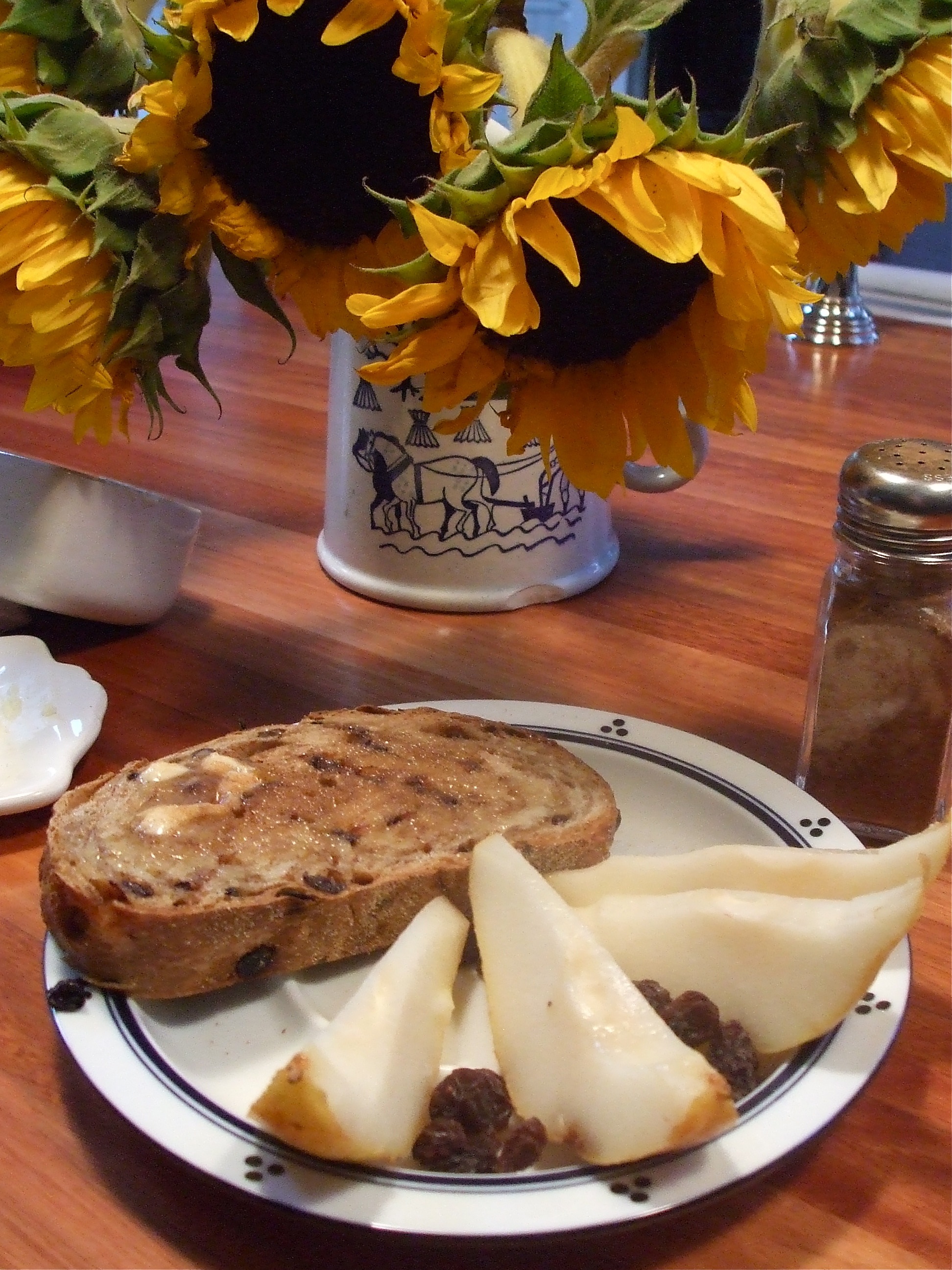 just today it came in cinnamon toast, studded with raisins, slathered with butter and drifted with mounds of cinnamon sugar. that toast shared the plate with a pear, sliced and juicy and waiting. for someone.