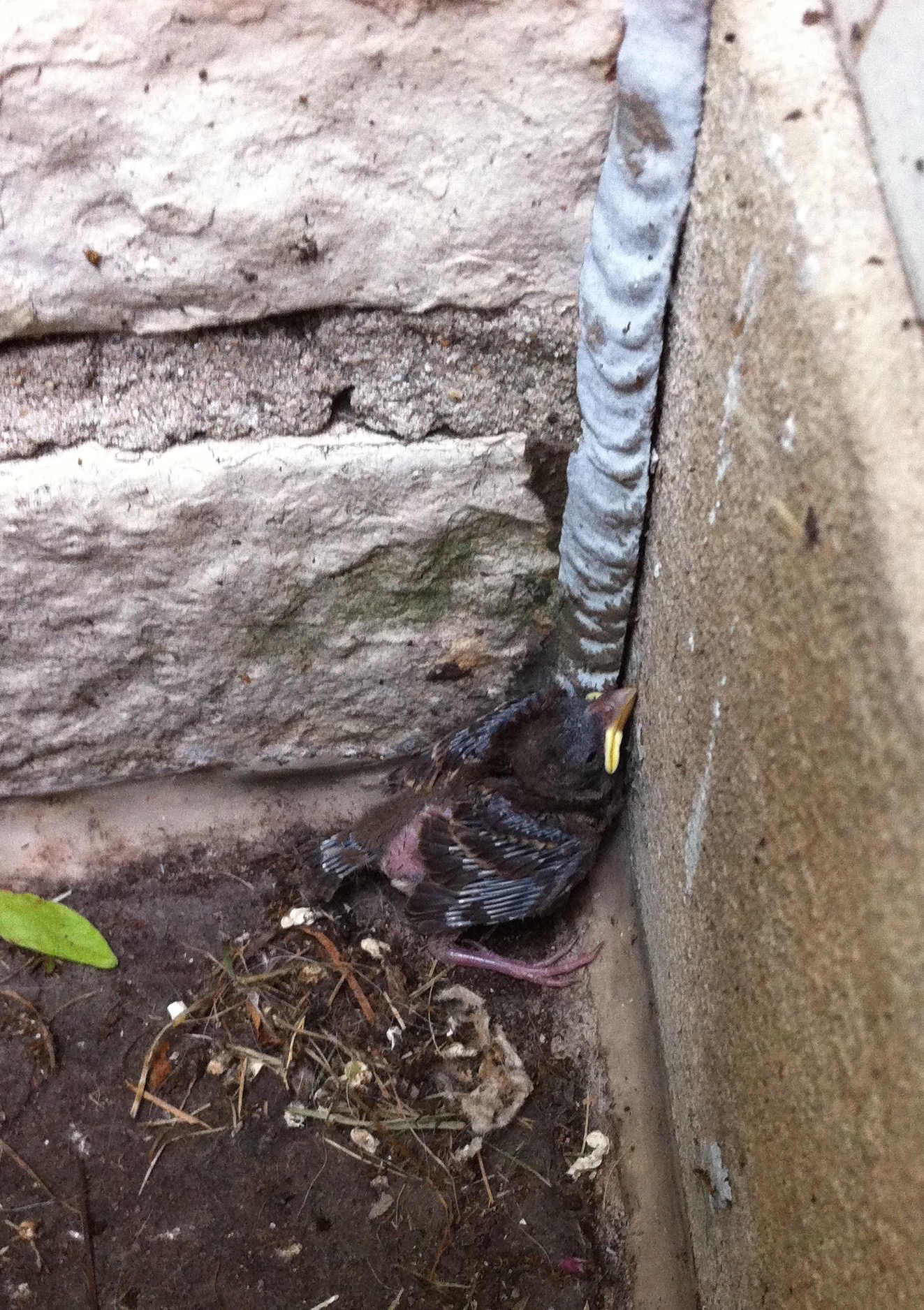 so it was the other afternoon when my little phone made a noise, and there popped a text balloon from my little fellow. he was tumbling out the door to soccer, lacing up his cleats, when suddenly he looked down and saw something amiss. he took me two pictures and typed, without pause for punctuation, apparently: “Hi mom I just saw a baby bird as I was sitting on the porch go look behind the pot of flowers I’m not sure if he is hurt but here are a couple pictures I would take a look”