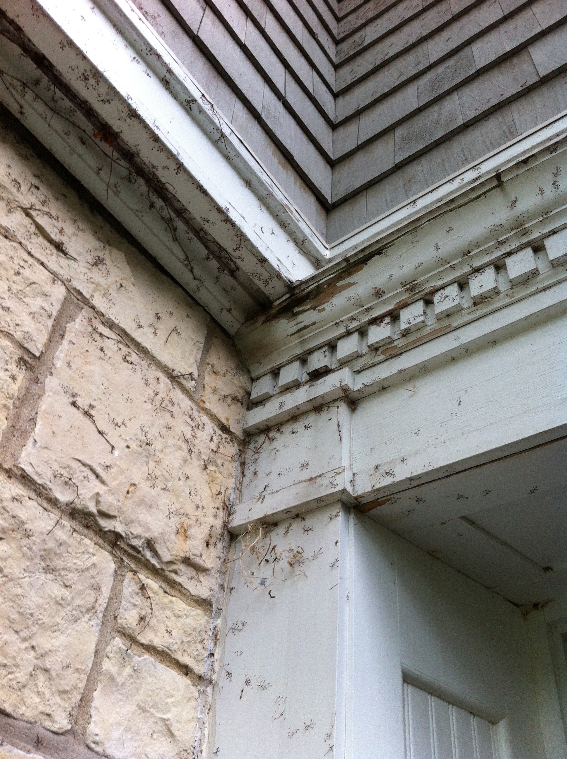 by the time i got home, the one little fledgling had company. now there were two fully-feathered, eyes-still-closed baby birds cowering behind the flower pot on the front stoop, a good seven or eight feet down from the nook behind the front door’s moulding where, every year since we put up the lovely fancy woodwork, those old birds have deigned to birth their young. and this despite the fact that up beneath the eaves of our old house we built the feathered flocks an ample nine-hole aerie for their avian pleasures.