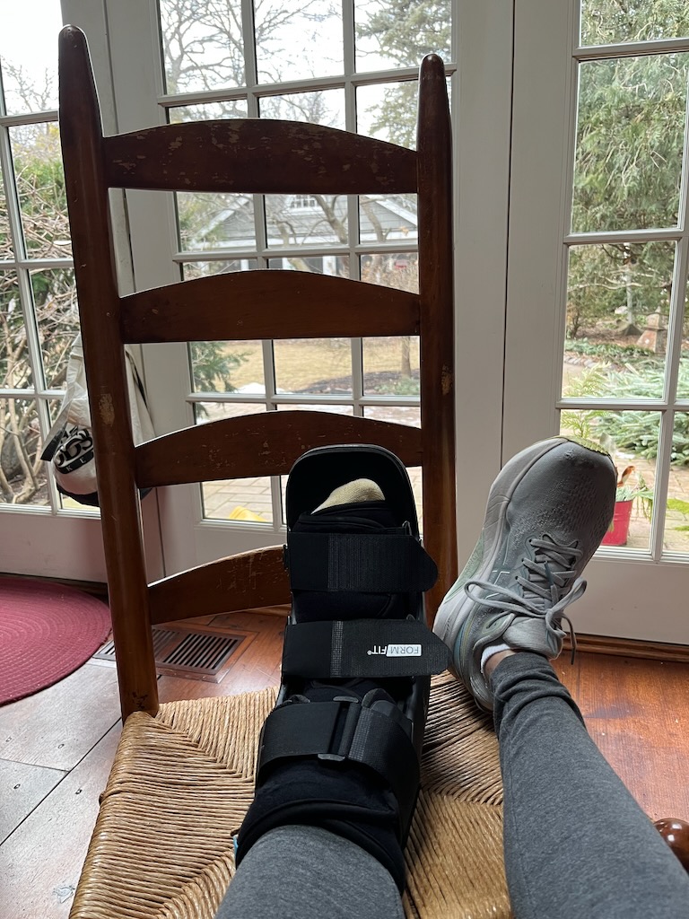 i hobbled home, after an otherwise uneventful walk on a stone-sprinkled beach, with an unhappy ankle.and a quick trip to the foot doc had me strapped into what feels like a leaden boot, and has curtailed my daily constitutionals for the next few weeks. but that’s not all: before week’s end, the resident triathlete in this old hovel had his knees poked and prodded and subjected to space-age medicine, and thus we’ve declared this the hobbledy house. indeed, we are a hobbling, most humbled pair, trading ice packs and heating pads, advil and tylenol, as prescribed by our duet of doctors.