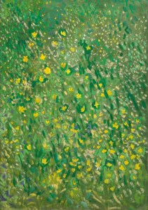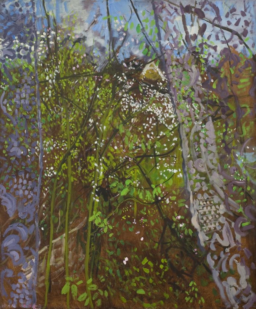 Cooke’s neglect of her garden—she sometimes called it ‘ungardening’—was partly a reflection of her priorities: her painting and the care of her children. Beyond these demands there was little energy to give less pressing concerns. Grass went unmown, fences unmended and trees unpruned. But the messy garden was not entirely accidental. The disarray was cultivated over an extended period of time and helped Cooke to create a new subgenre in works such as The Wild Plum Tree, which drew upon aspects of both landscape and garden painting traditions. Whereas Claude Monet’s waterlily pond was scrupulously tended, Jean Cooke’s rambling garden was unkempt to imperfection just as her painting required. Whereas earlier paintings such as Grassland had used the Sussex coastline to create landscape-scale wilderness, by the mid-eighties when she began painting spring blossom in earnest her own garden had achieved a similarly expansive quality.