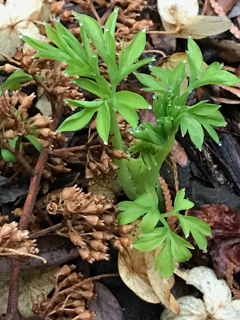 you notice that, once you’ve hauled out your magnifying lens, it’s not really all bleak. there is gazillions of action out there. why, there are sweet little clasps of leaves, gathered in prayer. and there are frilly umbrellas of green rising up from the detritus of winter.