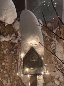 and so, as if never before, i am looking out at the snow-caked garden, at the beefeater-sized snow caps atop all my birdhouses and feeders, and i am whispering, whispering, inaudible prayers of pure and profound thanks. for the miracle of another winter. for the quotidian phone call from one of my boys. for the chance to sit in a near-freezing kitchen to work side-by-side my second born. for the husband who leaves his car in the snow, so i can pull into the snowless garage. and who waits till i get home late one night to eat his bowl of cereal, while i slurp my soup.