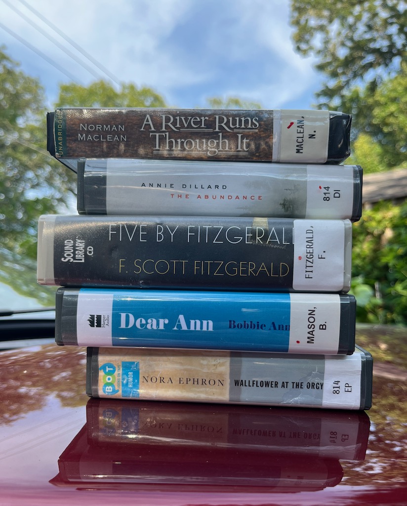 listening nook: because i’ll be coursing through the countryside in my red wagon this weekend, i’m bringing my reading nook on little discs. here’s the stack assembled from the library shelves: