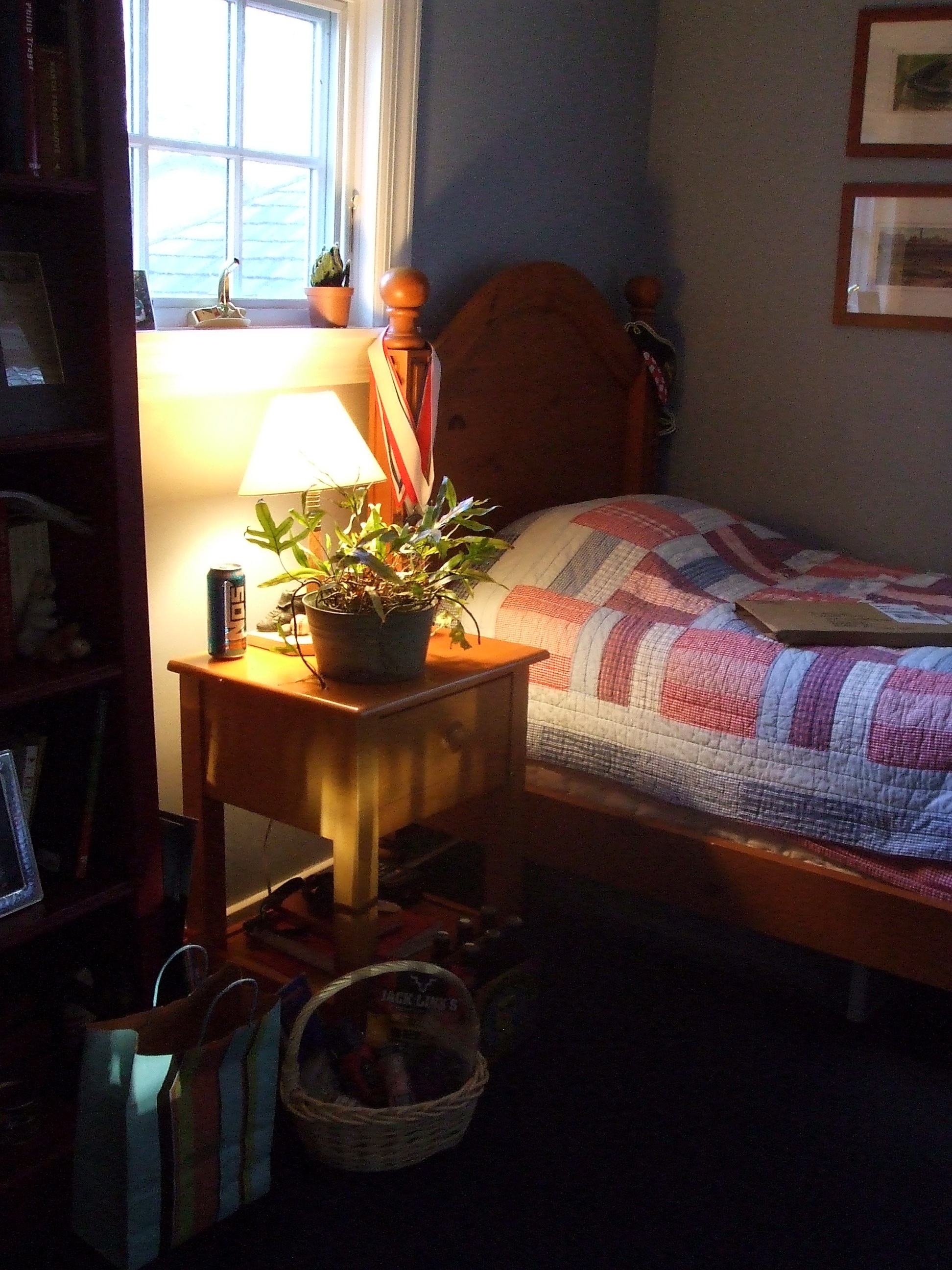 all i see is the room where i tucked into bed one reluctant sleeper, night after night, for sooo many years. where he learned how to read, and chased away night-prowling monsters. and another (the room at the bend in the stairs) where we brought home the boy with the broken neck. where he wrote his essays to get into college, and years and years later studied for LSATs. (and just a few weeks ago, home for easter, sat at the old desk and recorded a lecture for all of his first-year law students.)