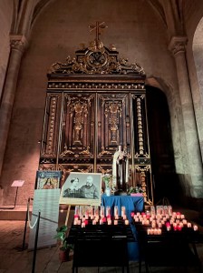 a little bit about a saint: i was one of those catholic school girls, the ones who wore plaid jumpers and were told to pick a saint upon which to model our ways, especially when it came time for our confirmation, and we got to wear white lacy dresses and the bishop would splotch our foreheads with oil. i picked therese of lisieux, the little flower of jesus, partly because i liked little flowers, and i always saw pictures of her surrounded by wee purple violets. i loved that in her quiet little way, she never abandoned love. and i too believed that in my quiet little ways i could make my way through the world, infusing little drops of love all along my route. i didn’t know until last week, when i stepped into a side chapel at the cathedral of chartres honoring the 150th anniversary of her birth, that therese was born the day before me. 84 years earlier. over the years i’ve discovered that dorothy day, one of my heroes, loved her too, for her teaching of “the little way”–by little acts of kindness, little acts of courage, little acts animated by love, we can shift the balance of love in the world. and it turns out that just this week, pope francis (yet another hero of mine, and yet another someone who loves saint therese) devoted his remarks in st. peter’s square to the little flower of jesus, imploring us to imitate her ways, by doing even the littlest things with great love. because she was sickly most of her life, and died at 24, pope francis went on to say that though her body was sickly, “her heart was vibrant and missionary.” i find particular resonance these days in a saint who saw herself as “a small grain of sand,” and who never let her bodily frailties impede her heart’s zeal.